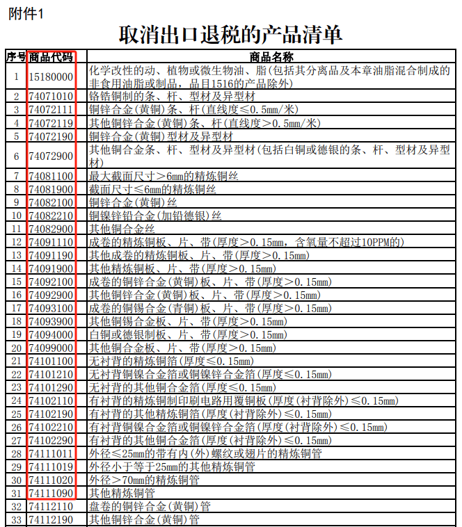 一是:打消不产产物的出口退税,包罗化学改性的动、动物或微生物油、脂,铝合金制空心异型材、铜锌合金丝等产物。二是:将部门产物的出口退税率由13%下调至9%,好比成本油、光伏,电池、部门非金属矿物成品。三是:该通知布告自2024年12月1日起实施。而且表白通知布告所列产物合用的出口退税率以出口货色报关单说明的出口日期界定。总共包含59个产物,除了通知布告提到的产物,好比精辟铜管、铜板,其他铜合金条等,